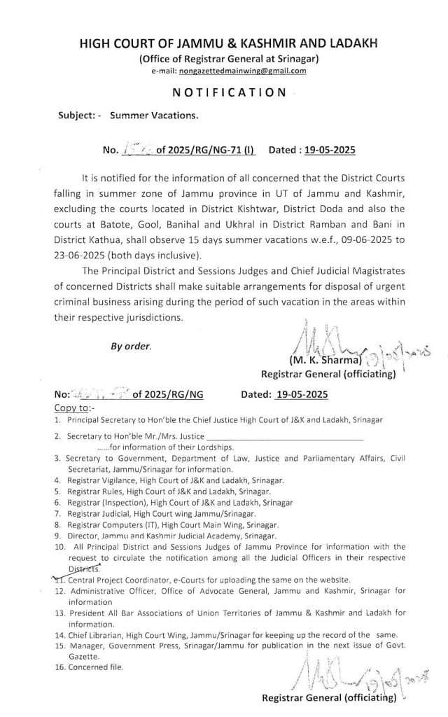 Official Notification: Summer Vacation in District Courts: JAMMU, May 19: The district courts in the summer zone of Jammu province excluding those in districts of Kishtwar and Doda and specific courts in Ramban and Kathua will observe a 15-day summer vacation from June 9 to June 23.