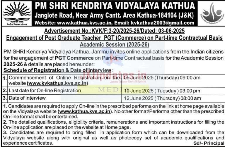 PGT Commerce Vacancy 2025 at PM SHRI Kendriya Vidyalaya Kathua – Apply Online Now : PM SHRI Kendriya Vidyalaya, Kathua (Jammu & Kashmir) is inviting applications from eligible Indian citizens for the Post Graduate Teacher (PGT) – Commerce post on a Part-Time Contractual Basis for the academic session 2025–26.