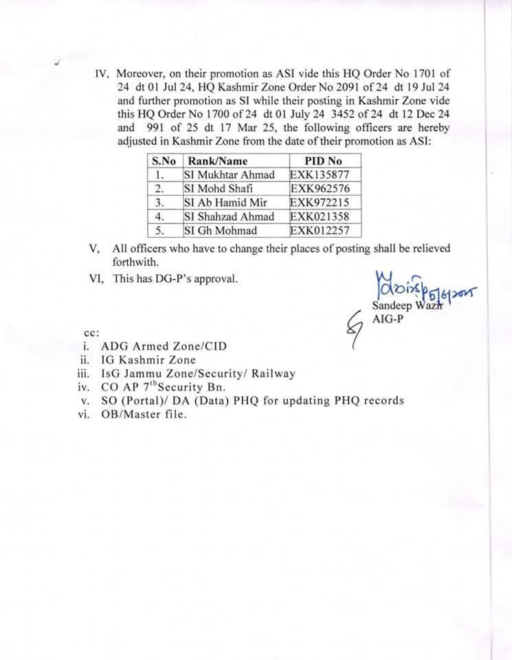 PHQ J&K orders transfer/postings of Police Inspectors/Sub Inspectors June 10, 2025June 10, 2025 by Dar ZahoorPHQ J&K orders transfer/postings of Police Inspectors/Sub Inspectors.WhatsApp Group Join NowObscene Acts in Bandipora Market: FIR Registered, Police Warn Against Rumours. Apply Now: KAWA College of Education Opens Vacancies for Various PositionsJK Job Fair 2025: Complete Schedule and Locations Guide Leave a Comment Cancel replyCommentName Email Website Save my name, email, and website in this browser for the next time I comment.