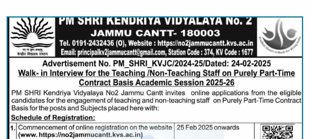 PM SHRI Kendriya Vidyalaya No. 2 Jammu Cantt invites online applications from eligible candidates for the recruitment of teaching and non-teaching staff on a purely part-time contractual basis for the academic session 2025-26.