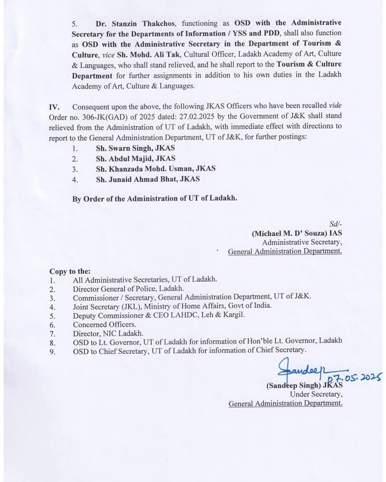 Recalling of Officers from Ladakh to J&K: Transfers & Postings May 7, 2025 by Dar ZahoorRecalling of Officers from Ladakh to J&K: Transfers & Postings.WhatsApp Group Join NowCRPF Constable Dies of Heart Attack in JK’s Mendhar Control Room has been established in Sopore Leave a Comment Cancel replyCommentName Email Website Save my name, email, and website in this browser for the next time I comment.