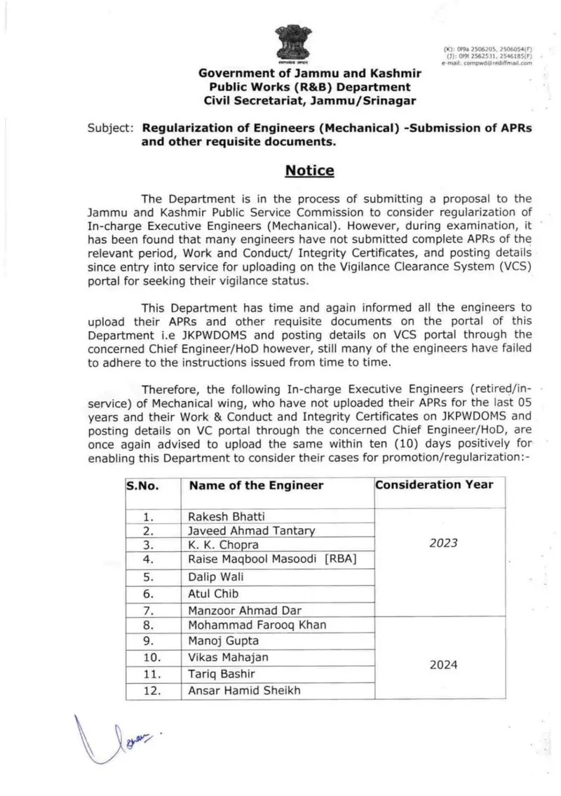 The Government of Jammu and Kashmir’s Public Works (R&B) Department is currently working on a proposal to regularize In-charge Executive Engineers (Mechanical). However, it has been noted that many engineers have not submitted the necessary documents, including their Annual Performance Reports (APRs), Work and Conduct/Integrity Certificates, and posting details since their entry into service. These documents are essential for uploading on the Vigilance Clearance System (VCS) portal to assess their vigilance status.