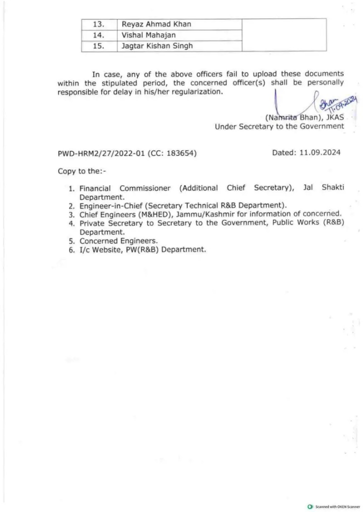 The department has repeatedly reminded engineers to upload their APRs and requisite documents on the JKPWDOMS portal and the VCS portal through their respective Chief Engineers or Heads of Departments. Despite these reminders, many engineers have not complied.