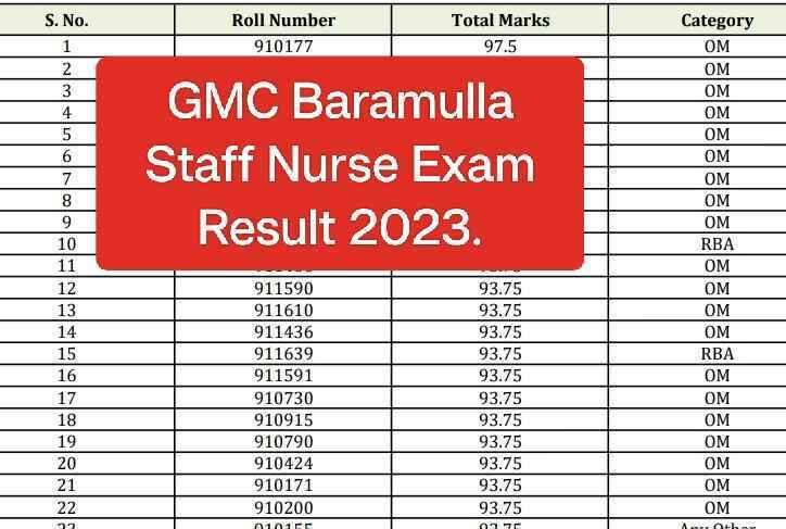 Result Declared for GMC Baramulla Staff Nurse Exam 2023:Result/Score Sheet of Candidates for the post of Staff Nurse/Public Health Nurse/ Jr. Staff Nurse in GMC Baramulla advertised vide Advertisement notification No 09 of 2023 dated 19-06-2023 held on 10-09-2023 regarding.