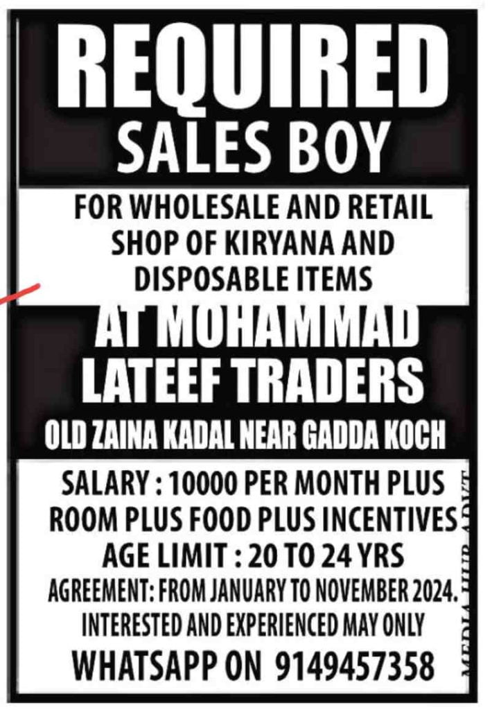 Salesman Job vacancies at Srinagar | Salary 10000.Job Opportunity: Sales Boy Needed for Kiryana and Disposable Items Shop