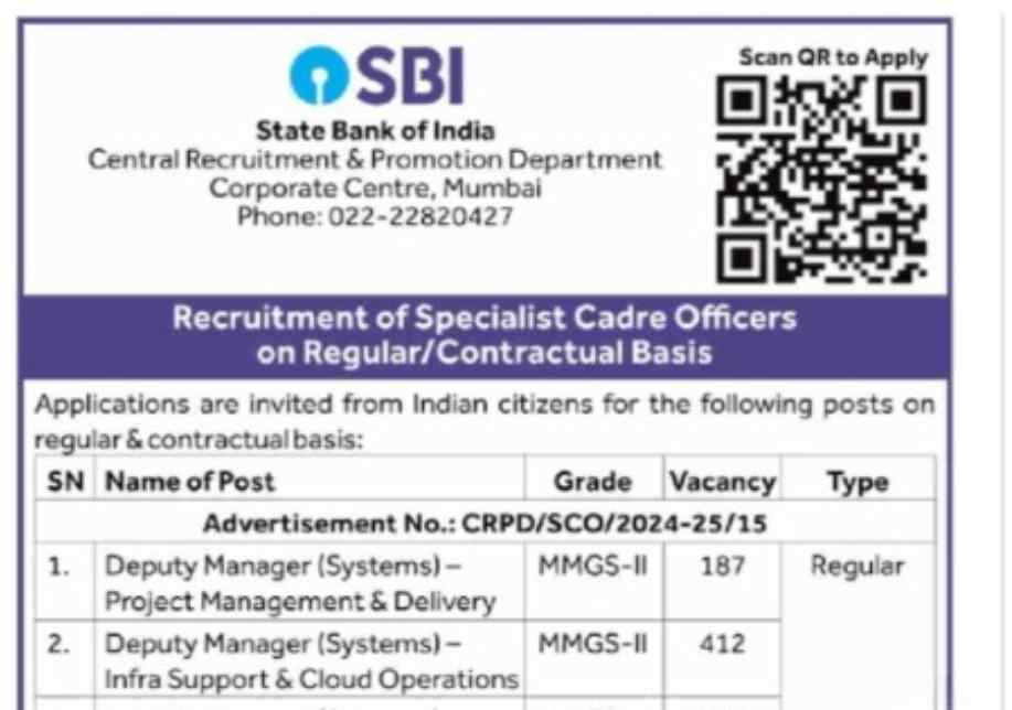 SBI Specialist Cadre Officers Recruitment 2024: The State Bank of India (SBI) has announced its latest recruitment drive for Specialist Cadre Officers on both Regular and Contractual basis. A total of 1513 vacancies have been released under Advertisement No. CRPD/SCO/2024-25/15 and CRPD/SCO/2024-25/16. Interested candidates can apply online via SBI’s official website from 14th September 2024 to 4th October 2024.