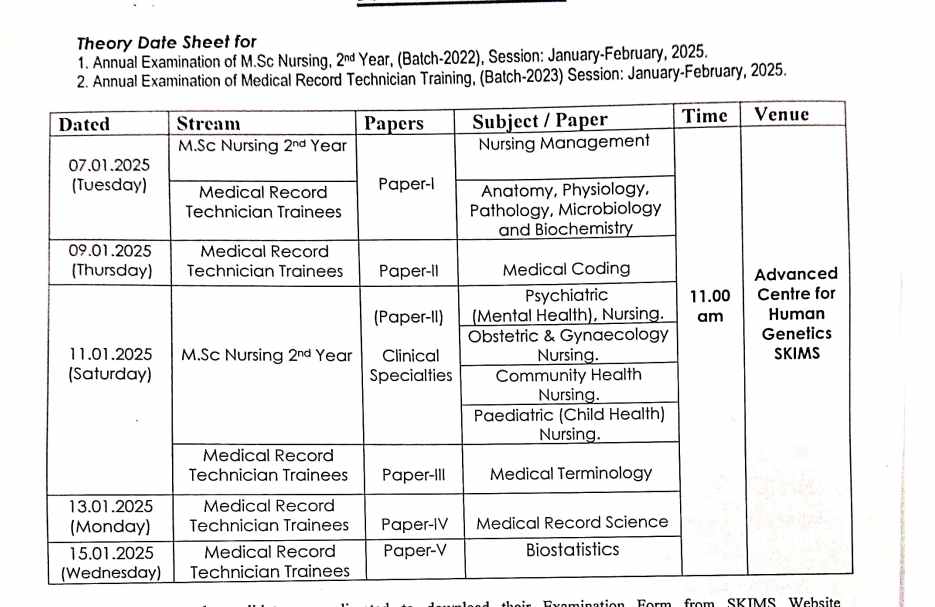 SKIMS M.Sc Nursing 2nd Year Theory Date Sheet Released