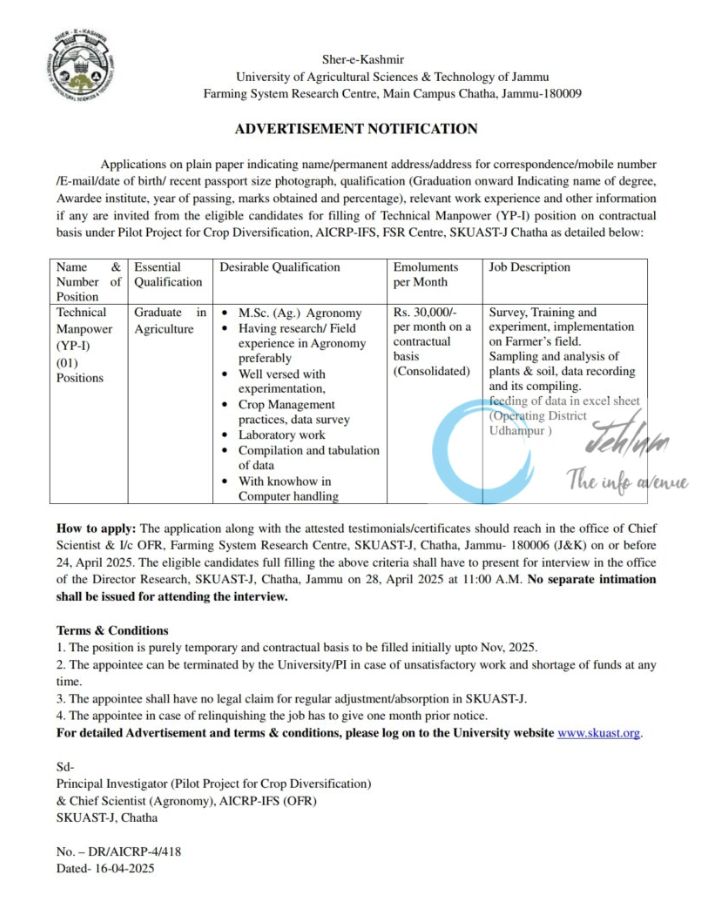 SKUAST Jammu Recruitment 2025: Sher-e-Kashmir University of Agricultural Sciences and Technology of Jammu (SKUAST-J) is inviting applications for the position of Technical Manpower (YP-I) on a contractual basis. This post is under the Pilot Project for Crop Diversification, AICRP-IFS at the Farming System Research Centre (FSRC), Main Campus Chatha, Jammu.