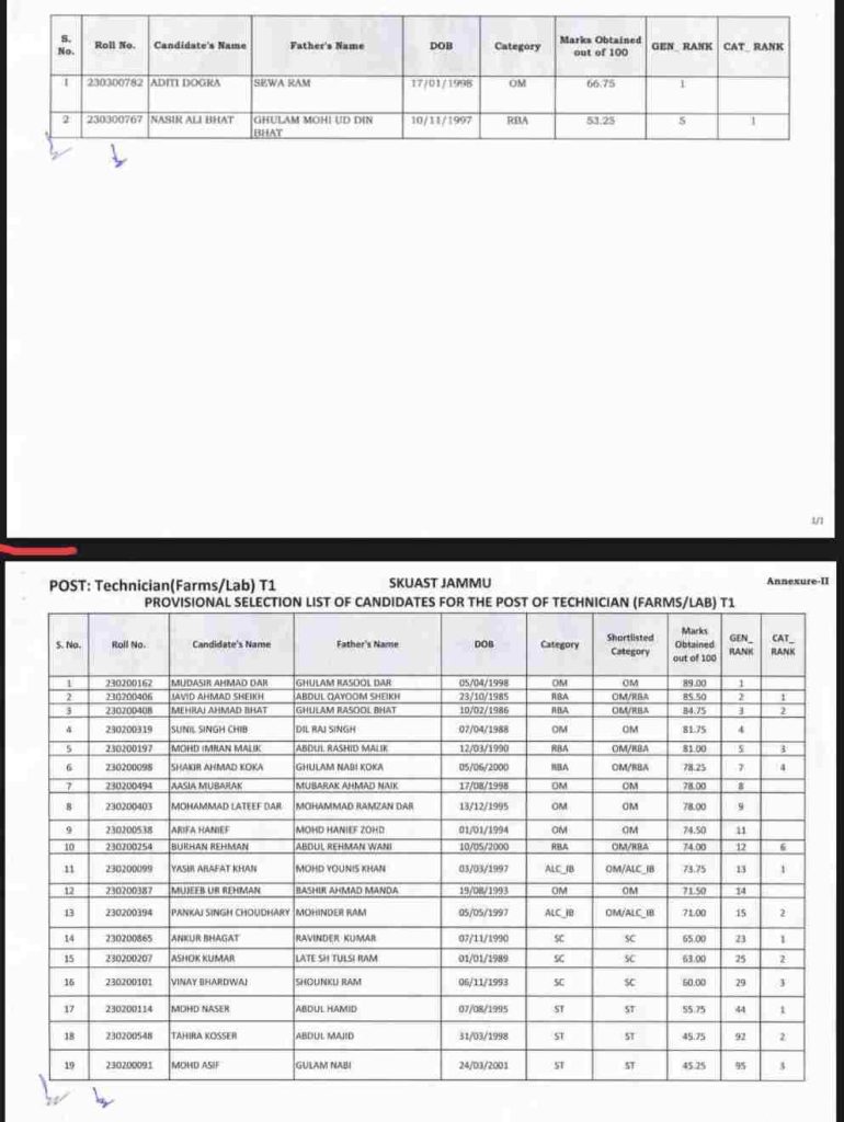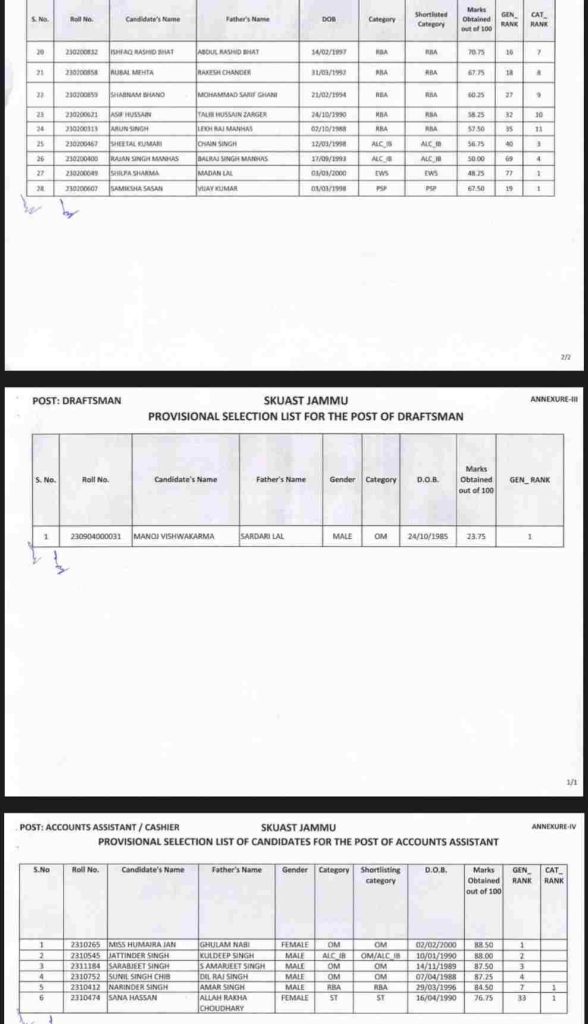 It is for the information of all the concerned that the provisional selection lists for the posts of (i) Technician (Farms/Labs/Clinics) T1, (ii) Technician (Farms/Labs) T1 (iii) Accounts Assistant/Cashier (iv) Draftsman, on the basis of overall merit of the candidates in written test, subsequent verification of the documents, ascertaining the eligibility by the designated Selection-cum-Document Verification Committee and approved by the Competent Authority, are available on University website www.skuast.org for the information of the candidates. DIP/J-5267-P, Dt: 10-02-2024