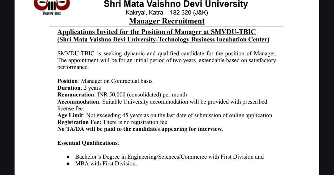 SMVDU Recruitment 2024: Manager Position, Monthly Salary Rs 50,000
