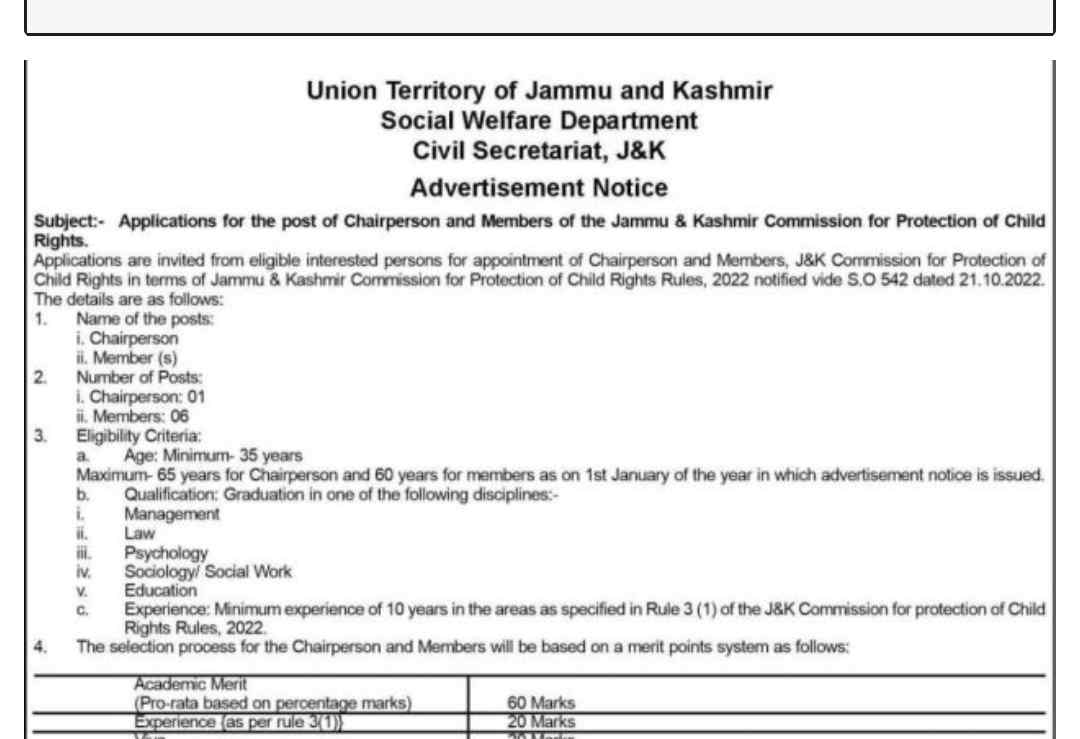 The Social Welfare Department of Jammu and Kashmir has announced a recruitment drive for the positions of Chairperson and Members of the Jammu & Kashmir Commission for Protection of Child Rights. Eligible and interested candidates are invited to apply for these prestigious roles in accordance with the J&K Commission for Protection of Child Rights Rules, 2022, which were notified through S.O. 542 dated 21.10.2022.