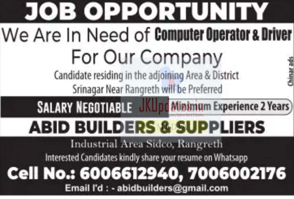 Srinagar Jobs : We Are In Need of Computer Operator it Driver For Our Company