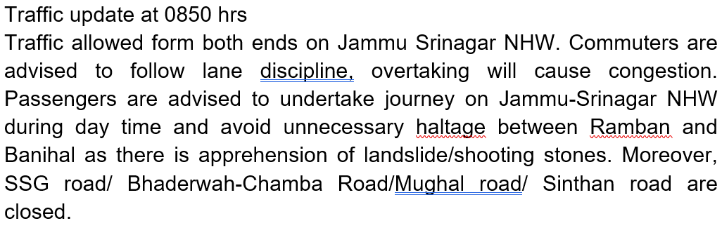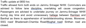 TRAFFIC POLICE HEADQUARTERS, J&K, JAMMU/SRINAGAR – Daily Jammu Srinagar National Highway Traffic Updates, National Highway Updates
