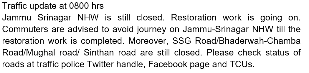 TRAFFIC POLICE HEADQUARTERS, J&K, JAMMU/SRINAGAR – Daily Jammu Srinagar National Highway Traffic Updates, National Highway Updates