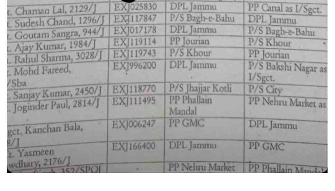 SSP Jammu Announces Transfer of 41 Police Personnel January 20, 2025 by Dar ZahoorJammu, Jan 19: SSP Jammu Announces Transfer of 41 Police PersonnelWhatsApp Group Join NowDetails Below: Minimum Temperatures Recorded Today (20 January 2025) In Jammu, Kashmir and Ladakh RegionsTransport Department on Saturday ordered the transfer of 13 officers in jk Leave a Comment Cancel replyCommentName Email Website Save my name, email, and website in this browser for the next time I comment.