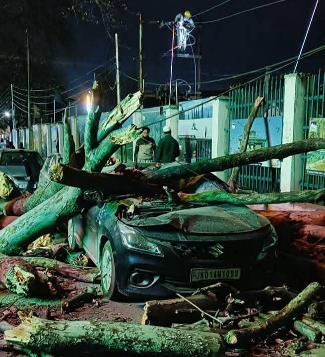 Srinagar, March 28: Heavy gusty winds swept across various parts of Kashmir valley on Friday night, causing significant damage to vehicles, rooftops, and power infrastructure.