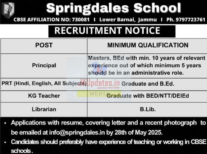 Teaching and Administrative Job Openings at Springdales School, Jammu – Apply by 28th May 2025 : Springdales School, Lower Barnai, Jammu is inviting applications from qualified and experienced professionals for multiple positions. The school is affiliated with CBSE and seeks passionate educators and staff to join its dedicated team.