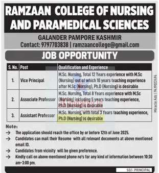 Ramzaan College of Nursing and Paramedical Sciences, located in Galander Pampore, Kashmir, invites applications from qualified and experienced candidates for the following academic positions: