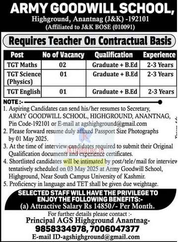 Teaching Vacancies Open at Army Goodwill School Anantnag – Apply by 1st May 2025: Army Goodwill School, Highground, Anantnag has announced multiple teaching vacancies for the upcoming academic session. The school is inviting applications from eligible candidates for the following positions: