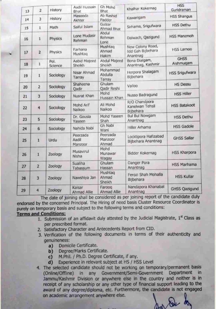 Anantnag – Temporary Hiring of Cluster Resource Coordinators for Teaching Support for the Academic Session (2024-25) Revised in Govt. High and Higher Secondary Schools of Kashmir Division.
