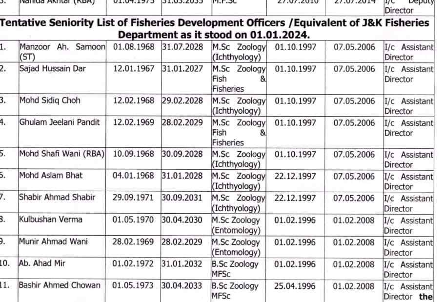 The Government of Jammu & Kashmir has issued the tentative seniority list for Deputy Directors, Assistant Directors, and Fisheries Development Officers of the J&K Fisheries Department, effective from 01.01.2024. This list comes in light of updates required due to promotions, retirements, and other changes that occurred since the previous seniority lists were issued under: