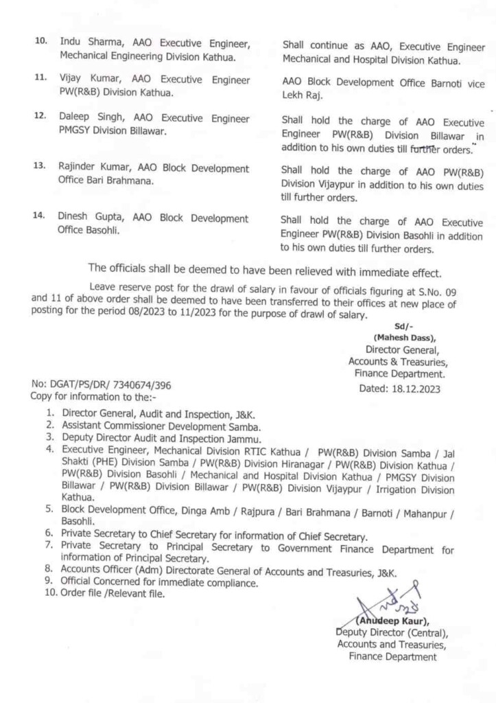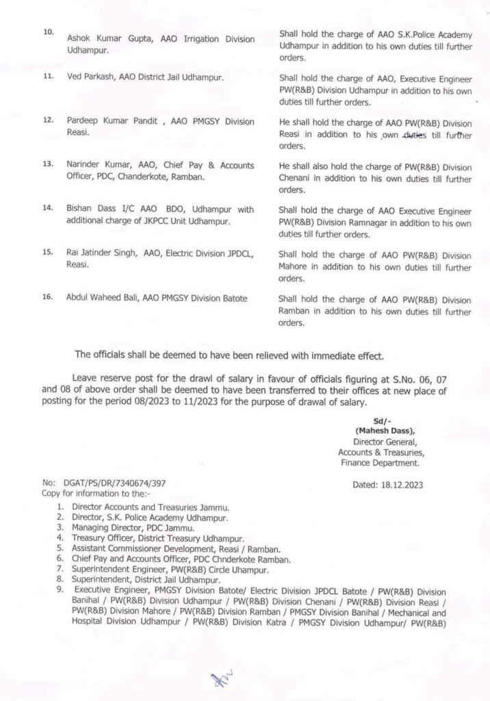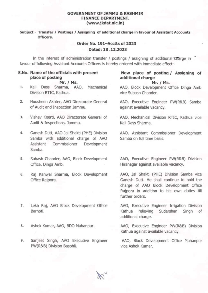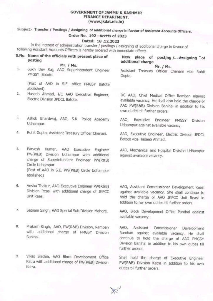 Transfer and Posting of 30 Assistant Accounts Officers in jk -The transfer, posting, or assignment of an extra charge to Assistant Accounts Officers.