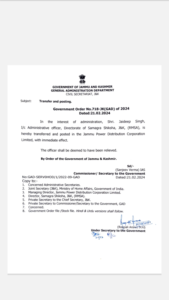 Jammu and Kashmir Govt Ordered Transfer and Postings Of Various Officials-ORDER COPY HERE