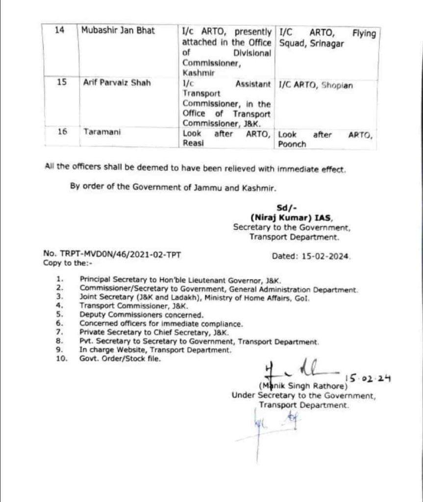Transfers and Postings of ARTOs, I/C ARTOs.Transfers and postings.Government Order No. 04-JK (TR) of 2024 Dated: 15-02-2024.Consequent upon the placement of the services of four Junior Scale JKAS Officers at the disposal of Transport Department vide Government Order No. 562-JK(GAD) of 2024 dated: 31-01-2024 and vide Government Order No. 594- JK(GAD) of 2024 dated: 12-02-2024 and in the interest of administration, the following transfers/postings of ARTOS and I/c ARTOS are hereby ordered with immediate effect:-