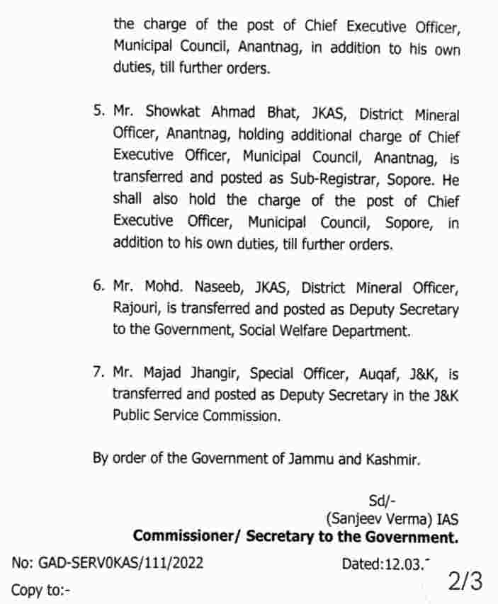 - Mr. Showkat Ahmad Bhat, JKAS, District Mineral Officer, Anantnag, holding additional charge of Chief Executive Officer, Municipal Council, Anantnag, is transferred and posted as Sub-Registrar, Sopore. He shall also hold the charge of the post of Chief Executive Officer, Municipal Council, Sopore, in addition to his own duties, till further orders.