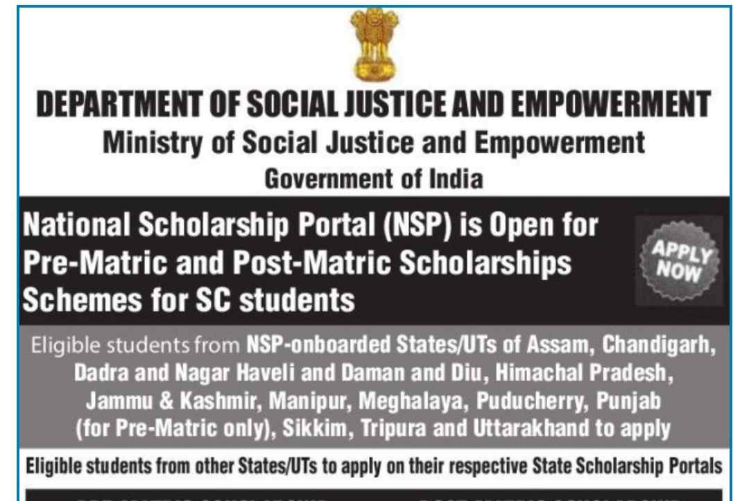 The National Scholarship Portal (NSP) is now open for applications for Pre-Matric and Post-Matric Scholarships specifically for SC students. Eligible students from the following NSP-onboarded States/UTs are encouraged to apply: