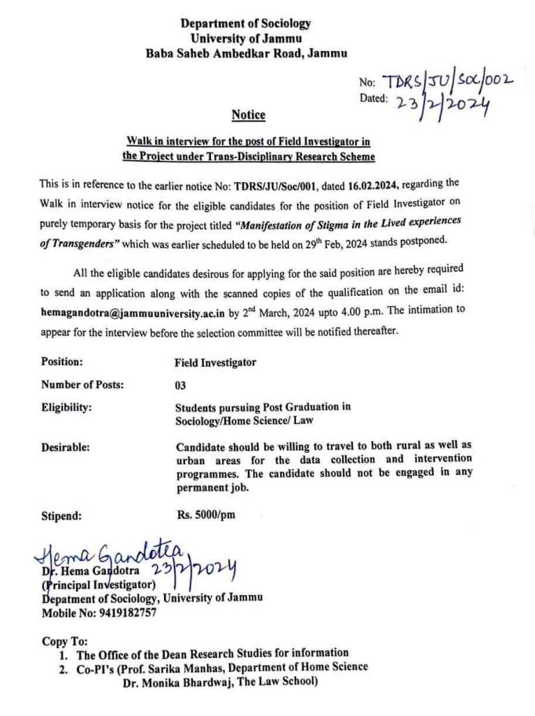 This is in reference to the earlier notice No: TDRS/JU/Soc/001, dated 16.02.2024, regarding the Walk in interview notice for the eligible candidates for the position of Field Investigator on purely temporary basis for the project titled “Manifestation of Stigma in the Lived experiences of Transgenders” which was earlier scheduled to be held on 29th Feb, 2024 stands postponed.