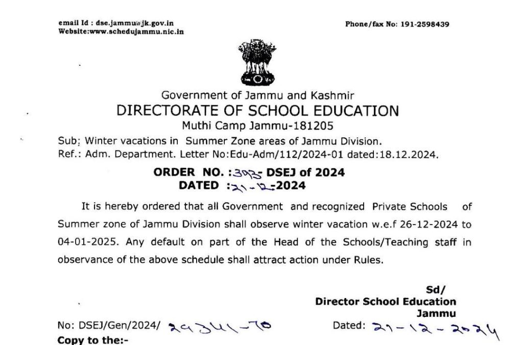 Good News: Schools in Jammu Division will observe winter holidays starting December 26.